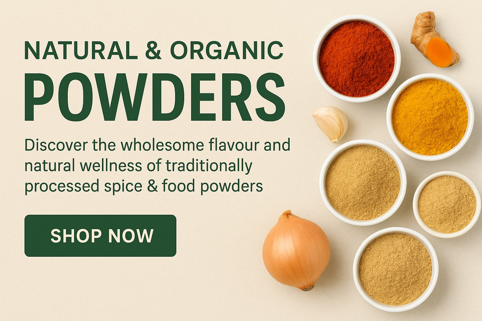 Discover the wholesome flavour and natural wellness of traditionally processed spice & food powders. 100% natural | No preservatives | No artificial colours | Farm-to-Table purity.